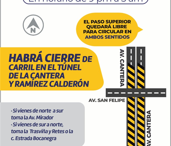 Con el objetivo de mejorar la visibilidad y seguridad de quienes transitan por la zona, el Gobierno Municipal, a través de la Dirección de Mantenimiento Urbano, realizará trabajos de limpieza y pintura en el túnel ubicado sobre la avenida La Cantera, a la altura de la calle Ramírez Calderón.