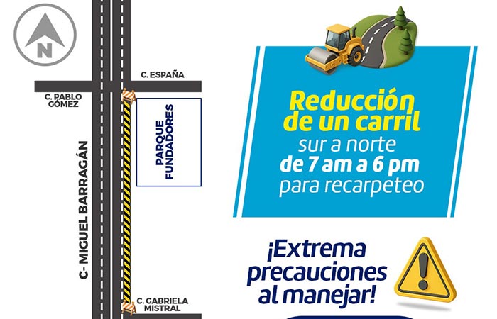 Chihuahua.- El Consejo de Urbanización Municipal (CUM), emite una alerta vial por los próximos trabajos de recarpeteo en el tramo de la avenida Miguel Barragán que abarca de la calle Gabriela Mistral hasta la calle España, de Sur a Norte, por lo que se exhorta a la ciudadanía a circular con precaución por el sector.