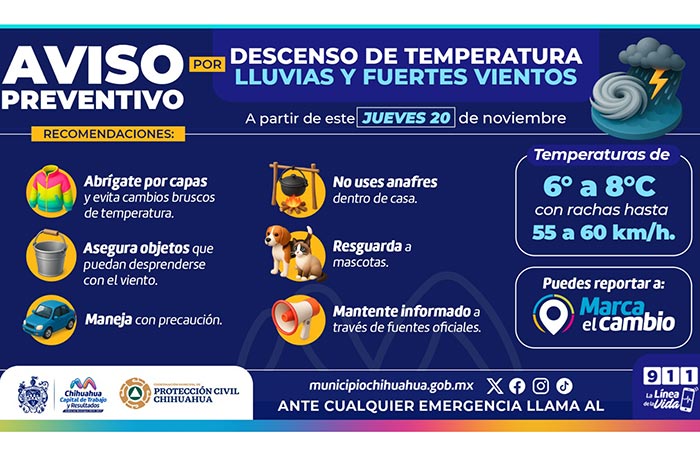La Coordinación Municipal de Protección Civil mantiene monitoreo permanente e invita a la población a mantenerse informada a través de las fuentes oficiales del Gobierno Municipal de Chihuahua.