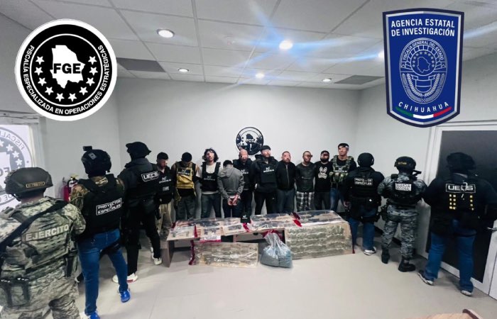 Chihuahua.- Fueron 10 detenidos en flagrancia por violación a la Ley General de Arma de Fuego y Explosivos, delitos contra la salud, tentativa de homicidio y daños, en el Sauz, municipio de Chihuahua, informó la Fiscalía Especializada en Operaciones Estratégicas.