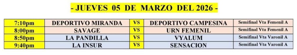 Las semifinales de ida se disputarán este martes 3 de marzo. En la rama Femenil A, Deportivo Campesina enfrentará a Deportivo Miranda, mientras que URN Femenil chocará ante Savage. En la Varonil A, Vyalum se medirá frente a La Pandilla y Sensación hará lo propio ante La Insur.