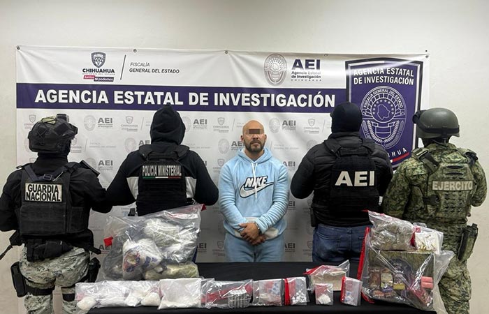 Cd. Juárez.- Derivado de una investigación a cargo de la Fiscalía de Distrito Zona Norte, elementos de la Agencia Estatal de Investigación, cumplimentaron una orden de cateo en un domicilio de la colonia Lucio Cabañas, en Ciudad Juárez, en donde detuvieron a quien dijo llamarse Daniel Alberto G. P. y aseguraron diversos narcóticos y cartuchos útiles.