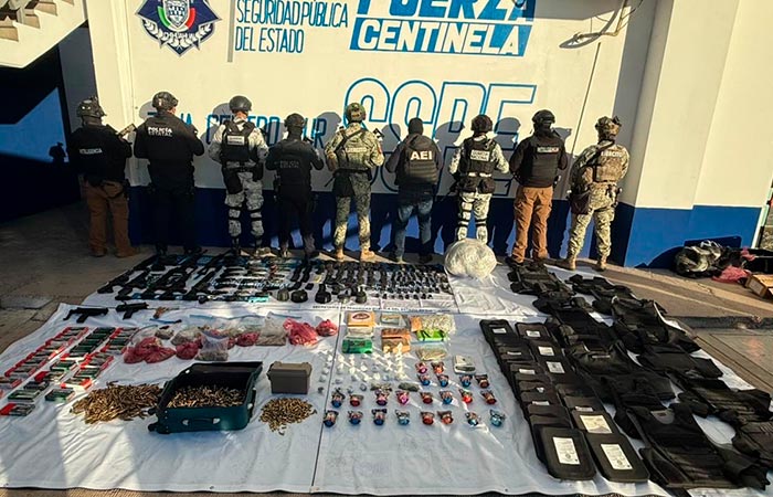 Durante el reconocimiento del inmueble, y tras observar desde el exterior indicios evidentes de actividades ilícitas, se aseguró un arsenal compuesto por 9 armas largas, 30 armas cortas, 36 cargadores para arma larga, 60 cargadores para arma corta, 5 cargadores de tambor, aproximadamente 5 mil cartuchos útiles, 14 chalecos balísticos y 25 placas balísticas.