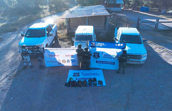 Durante las acciones efectuadas en coordinación con personal de la Guardia Nacional y Defensa en la localidad de Siquirichi, los agentes localizaron una camioneta Dodge Ram 2019 con reporte de robo; una Ford F-250 Super Duty 2022 y un Jeep Wrangler 2021, ambos con alteraciones en su identificación vehicular.