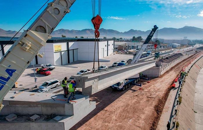 Chihuahua.- El alcalde Marco Bonilla supervisó los trabajos de montaje de trabes en el cuerpo norte del Paso Superior de la Vialidad Los Nogales e Industrias, obra con la que se busca fortalecer la movilidad en el norte de Chihuahua Capital.