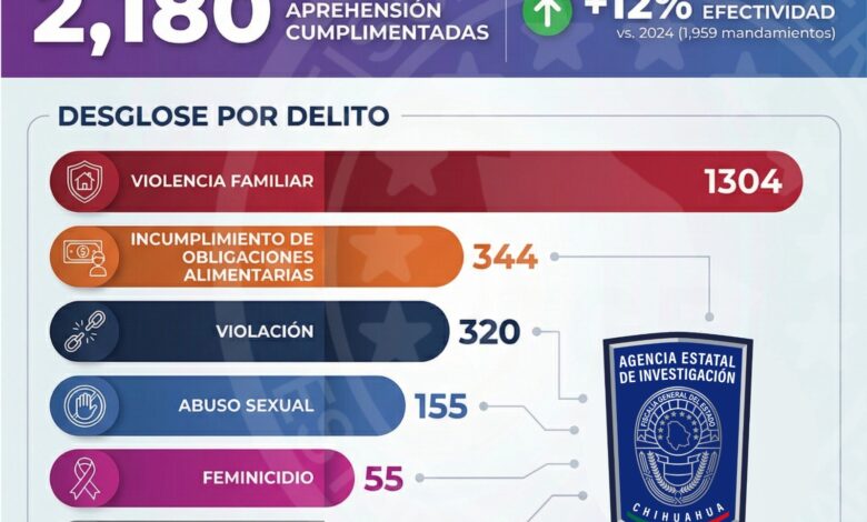 Derivado de investigaciones a cargo de la Fiscalía Especializada en Atención a Mujeres Víctimas del Delito por Razones de Género y a la Familia, elementos de la Agencia Estatal de investigación ejecutaron 2 mil 180 órdenes de aprehensión durante el año 2025.