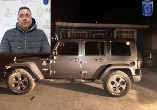 Elementos de la Agencia Estatal de Investigación que participan en el operativo de prevención y vigilancia implementado en el municipio de Madera, detuvieron a un masculino que tripulaba un vehículo de la marca Jeep, línea Wrangler, modelo 2017, color gris, con reporte de robo interpuesto el 19 de febrero del 2024 en Ciudad Juárez.