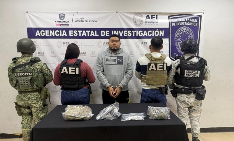 Elementos de la Agencia Estatal de Investigación (AEI), del Centro de Operaciones Estratégicas (COE), detuvieron en flagrancia a quien se identificó como Roberto Rubén O. A., por delitos contra la salud y violación a la Ley Federal de Armas de Fuego y Explosivos de uso Exclusivo del Ejército, en Ciudad Juárez.