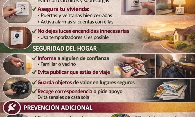 En materia de seguridad, Protección Civil recomendó informar a una persona de confianza, ya sea un familiar o vecino, sobre la ausencia, además de evitar publicar en redes sociales que se está fuera de casa. También se pidió resguardar objetos de valor en lugares seguros y solicitar apoyo para recoger correspondencia, con el fin de evitar señales de vivienda desocupada.