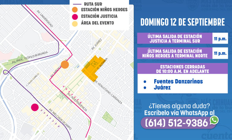 La Secretaría General de Gobierno, a través de la Operadora de Transporte (OTV), informa a las y los usuarios del sistema Bowí que, con motivo del cierre del Festival Internacional de la Ciudad de Chihuahua (FICUU) 2025, este domingo 12 de octubre el servicio extenderá su horario de operación.