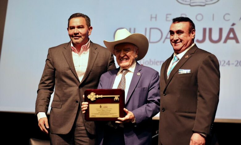 “Que estas llaves no sean solamente un recuerdo, sino el testimonio tangible del afecto y respeto de nuestra comunidad. Don Demetrio, nuestro reconocimiento más sincero y sea siempre bienvenido a Ciudad Juárez”, expresó el alcalde Pérez Cuéllar.