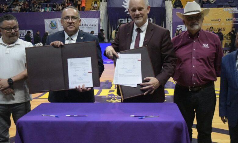 Durante el encuentro deportivo binacional de básquetbol entre los Dorados de la Universidad Autónoma de Chihuahua y los Aggies de la New Mexico State University, se llevó a cabo la firma de un convenio de colaboración académica que permitirá ofrecer programas de doble titulación en áreas del sector agropecuario.