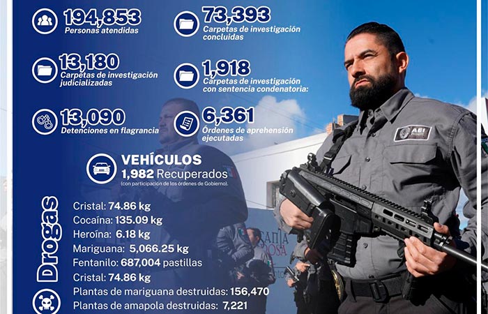 Chihuahua.- Alrededor de 200 mil personas atendidas, más de 73 mil carpetas de investigación concluidas, 13 mil 180 judicializadas y más de mil 900 sentencias condenatorias, son algunos de los resultados obtenidos en las diversas áreas de la procuración de justicia por la Fiscalía General del Estado, en el periodo de enero a octubre del 2025.