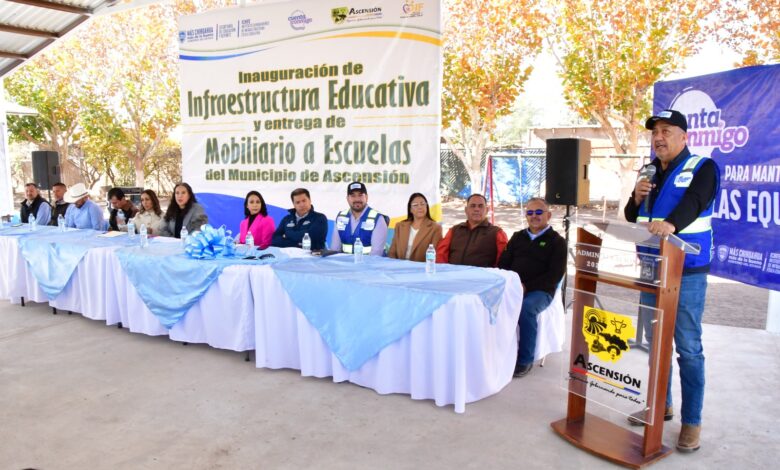 La Secretaría de Educación y Deporte (SEyD) en coordinación con el Ayuntamiento de Ascensión inauguró la instalación de una techumbre, y entregó mobiliario diverso a planteles de Educación Básica de esta población.