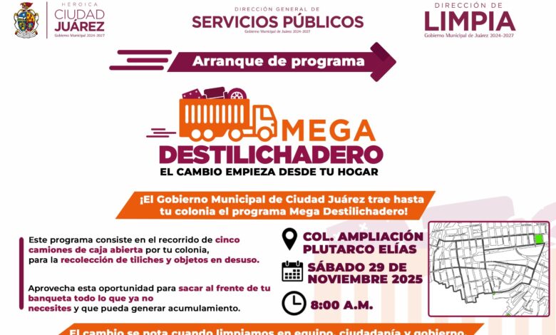 La Dirección General de Servicios Públicos Municipales, a través de la Dirección de Limpia, llevará mañana sábado el programa Mega Destilichadero hasta la colonia Plutarco Elías Calles, ubicada hacia el poniente de Juárez.
