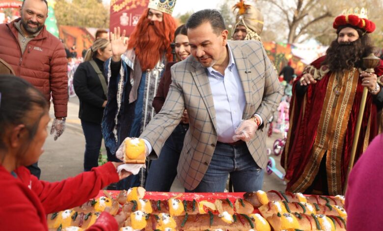 Cientos de familias juarenses acudieron esta tarde al parque DIF, situado en la avenida Heroico Colegio Militar, para partir la rosca gigante de 300 metros por el Día de los Reyes Magos.