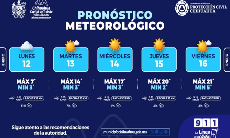 Chihuahua.- La Coordinación Municipal de Protección Civil informa que, durante la semana del lunes 12 al viernes 16 de enero, se presentarán temperaturas frías por las mañanas, con un gradual incremento en las máximas hacia el cierre de la semana en la capital del estado.