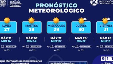 Para el sábado, se pronostica la elevación de la temperatura a 34°C, y una mínima de 14°C, con cielo parcialmente nublado y ráfagas de viento con hasta 45 kilómetros por hora. Finalmente, el domingo se espera una máxima de 33°C y una mínima de 16°C, con cielo soleado.