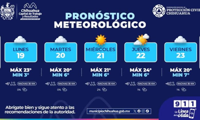 De acuerdo al Servicio Meteorológico Nacional de CONAGUA, para el lunes 19 de enero, se pronostica una temperatura máxima de 23°C y mínima de 3°C, con cielo parcialmente nublado.