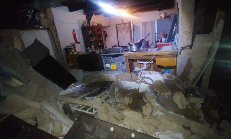 Al arribar al lugar, personal operativo constató el colapso de una pared de adobe de aproximadamente 4 por 2 metros de altura, correspondiente a un cuarto del inmueble. Afortunadamente, no se registraron personas lesionadas.