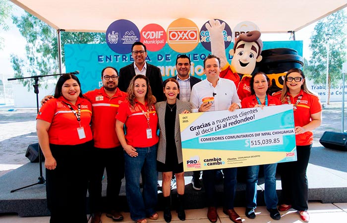 Chihuahua.- El alcalde Marco Bonilla y la presidenta del DIF Municipal, Karina Olivas, recibieron de la cadena comercial OXXO un cheque por 515 mil 39 pesos, producto del redondeo “Cambio x Cambio” realizado durante tres meses en más de 300 tiendas de la plaza Chihuahua Desierto, cuyos fondos se destinarán a fortalecer los comedores comunitarios del DIF Municipal.