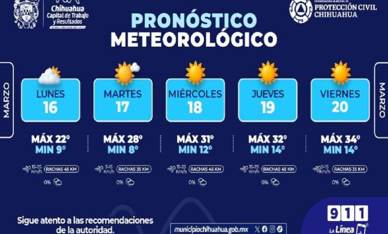 Para el martes se prevé una máxima de 28°C y mínima de 8°C grados, con cielo mayormente soleado y rachas de viento de hasta 35 kilómetros por hora. Asimismo, para este miércoles una máxima de 31°C, mínima de 12°C, condiciones soleadas y vientos de hasta 45 kilómetros por hora.