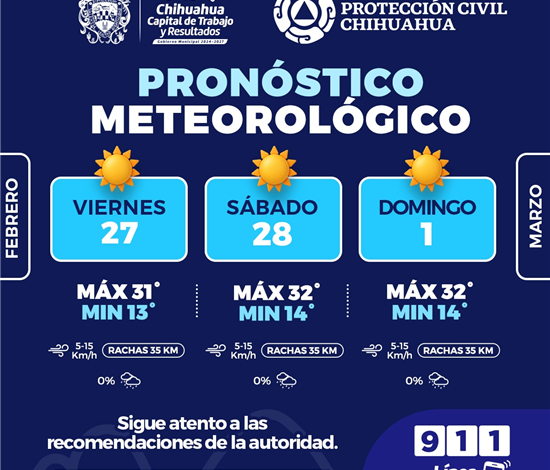 La Coordinación Municipal de Protección Civil informa que, para este fin de semana del 27 de febrero al 1 de marzo, se esperan condiciones mayormente soleadas, así como un incremento en las temperaturas en la capital del estado.