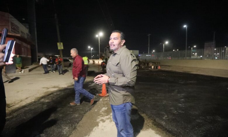 El Presidente Municipal, Cruz Pérez Cuéllar supervisó anoche las labores de bacheo en la calle Miguel Hidalgo, en la colonia Salvárcar, trabajos que se llevan a cabo como parte del programa de las Brigadas Especiales de Bacheo.